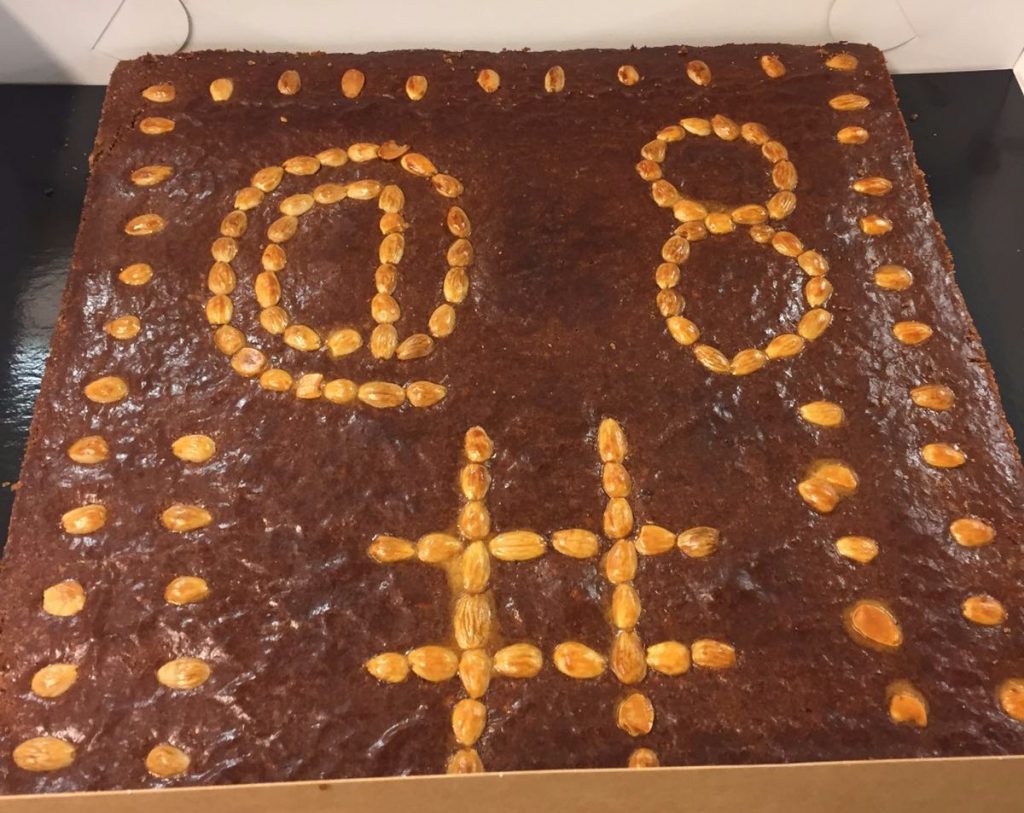 Deze grote gevulde speculaas taart is gemaakt en bezorgd door Bakkerij Olsman uit Hardenberg.