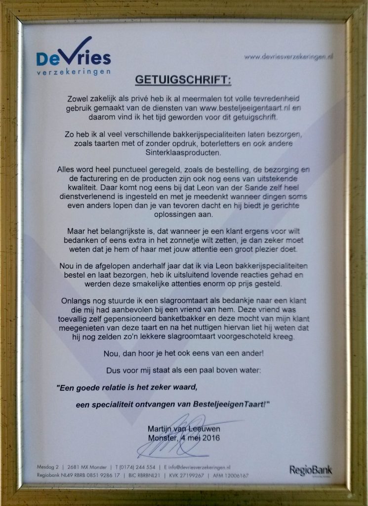 Zowel zakelijk als privé heb ik al meermalen tot volle tevredenheid gebruik gemaakt van de diensten van www.besteljeeigentaart.nl en daarom vind ik het tijd geworden voor dit getuigschrift.