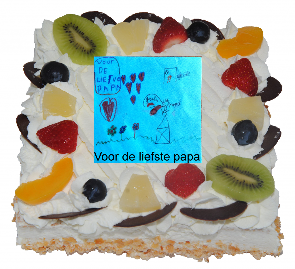 Zondag aanstaande is het weer vaderdag. Wat is dan leuker voor vader om een taart te ontvangen die de kinderen zelf hebben ontworpen? Dat kan een foto zijn van een tekening van één van de kinderen, een vakantiefoto en/of een tekst op de taart die de kinderen zelf hebben bedacht.